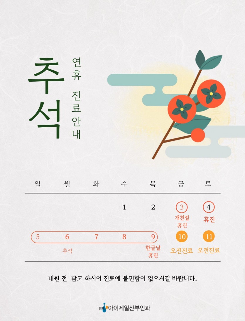 [아이제일소식] <진료> 2025년 10월 추석 연휴 안내 작성일 : 2025.09.24 아이제일산부인과 댓글 : 0 조회 : 329 10/3 (금)~ 10/9 (목) 아이제일 산부인과 * 소이과 휴진10/10 (금) 오전진료한상확 원장님 강소희 원장님10/11 (토) 오전진료한상확 원장님 안승희 원장님
